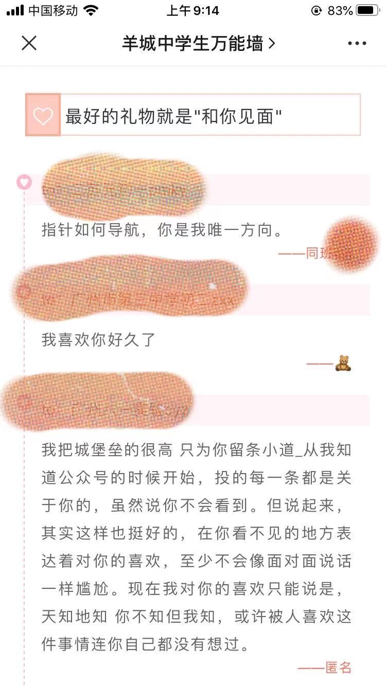 记者发现,有些告白是摘抄情话,有的则是原创,大部分都显得深情、文艺又有文采。例如有人表白越秀区某中学高一学生时说:“人们从诗人的字句里,选取自己心爱的意义,但诗句的最终意义是指向你。”还有人表白从化区某校高一的学生:“我像一只谨慎的兔子,壮着胆子喜欢你,可你却不知道我的爱意。”有人表白海珠区某高二的同学:“你是年少的欢喜这一句话倒过来也是你。”还有人表白初一的小朋友:“你是无法企及的光,戒不掉的想象,无法放弃的喜欢。”这些甜度爆表的表白,让不少青春期的少男少女们趋之若鹜。