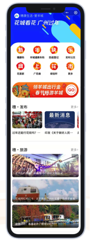记者了解到,“穗康生活·爱羊城”平台是基于“穗康码”平台4100万实名用户及“羊城通”平台3800万实名用户建设的广州本地生活平台。平台1.0版本建设了包括“穗发布”“穗出行”“穗旅游”“穗优享”“穗生活”“穗安康”六大版块。同时,平台针对春节期间推出“三重好礼”,包括“云逛花市”“商家折扣福利”以及“旅游出行礼券发放”。