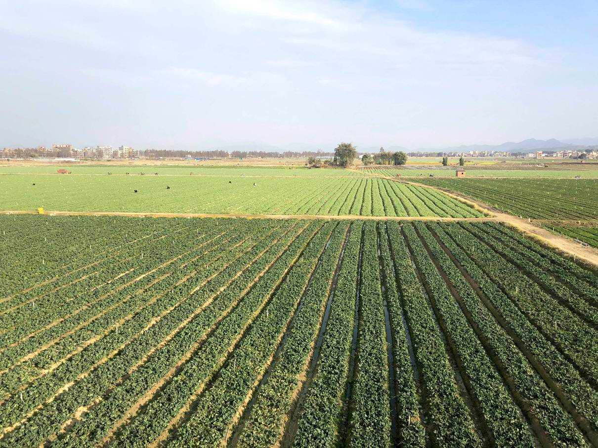 在城南镇美青菜场,连片平整的土地上,种满了豆苗、油菜、芥蓝、菜心等绿油油的青菜,远远看去就像是一层绿毯盖在了土地上,菜场上有许多工人正在忙碌着。该菜场是城南镇早期引进的大型农业企业之一,2009年,美青农业以土地流转的方式从农户手中获得了大片连整的土地,开展有机蔬菜连片化大规模的种植。目前,该基地被认定为粤港澳大湾区“菜篮子”生产基地,2019年被认定为“广东省农产品出口示范基地”。