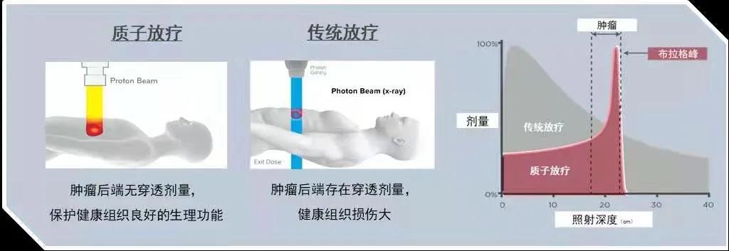 质子治疗是利用失掉电子的氢原子原子核,经回旋加速器或者同步加速器加速到光速约70%,高速穿透到人体内部,到达病灶区域,然后速度突然降低并停止,释放出最大能量,产生具有强大杀伤力的布拉格峰,将有害细胞杀死,同时有效地保护周围正常组织不受损害,降低诱发并发症的几率;具有疗效好、精准度高、安全性强、副作用小的特点,被誉为“治癌利器”。