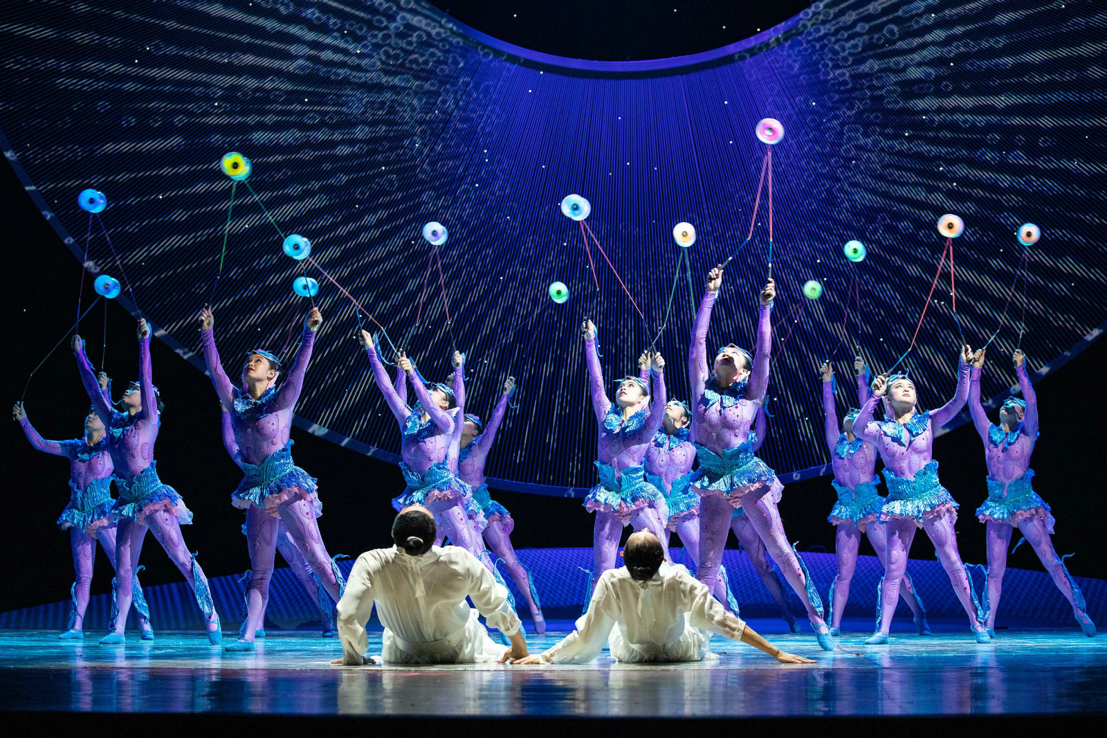 《化·蝶》情节饱满,内涵丰富。第一幕中梁祝初识的场景,编排了大量群体节目。演员们化作栩栩如生的彩蝶,伴随灵动轻快的音乐,与大气典雅的舞美配合,通过空竹、软功、蹬人、蹬伞、球技等数十种杂技节目的创新表演,展现闺阁中、书院里的少女柔情、少年爽朗。