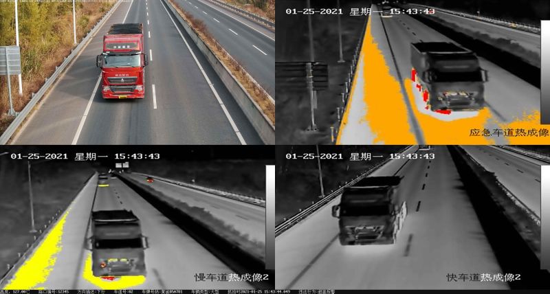 连英高速金门特长隧道位于清远英德市境内,全长约6.5公里,是省内已通车高速中最长的隧道。在车辆进入隧道前5公里,预警监测系统通过安装在龙门架的热成像摄像机,采集热红外波段监测车辆温度,如出现异常高温(超过160摄氏度),高速监控中心大约2秒就会收到预警,系统还会显示抓拍的车牌号码、过车图片、热感图片、录像等信息。监控中心即可立刻通过高速公路上的情报板发布预警信息,引导车辆进入隧道前的服务区或下高速,查看检修或熄火降温。