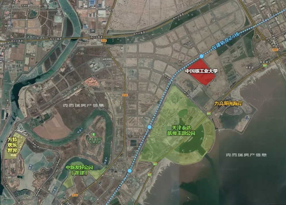 中国核工业大学项目位于中新天津生态城板块北端,东至玉砂道,南至渔泽路,西至云溪道,北至渔帆路。项目紧邻在建轨道交通Z4线玉砂道站,南侧靠近天津泰达航母主题公园。