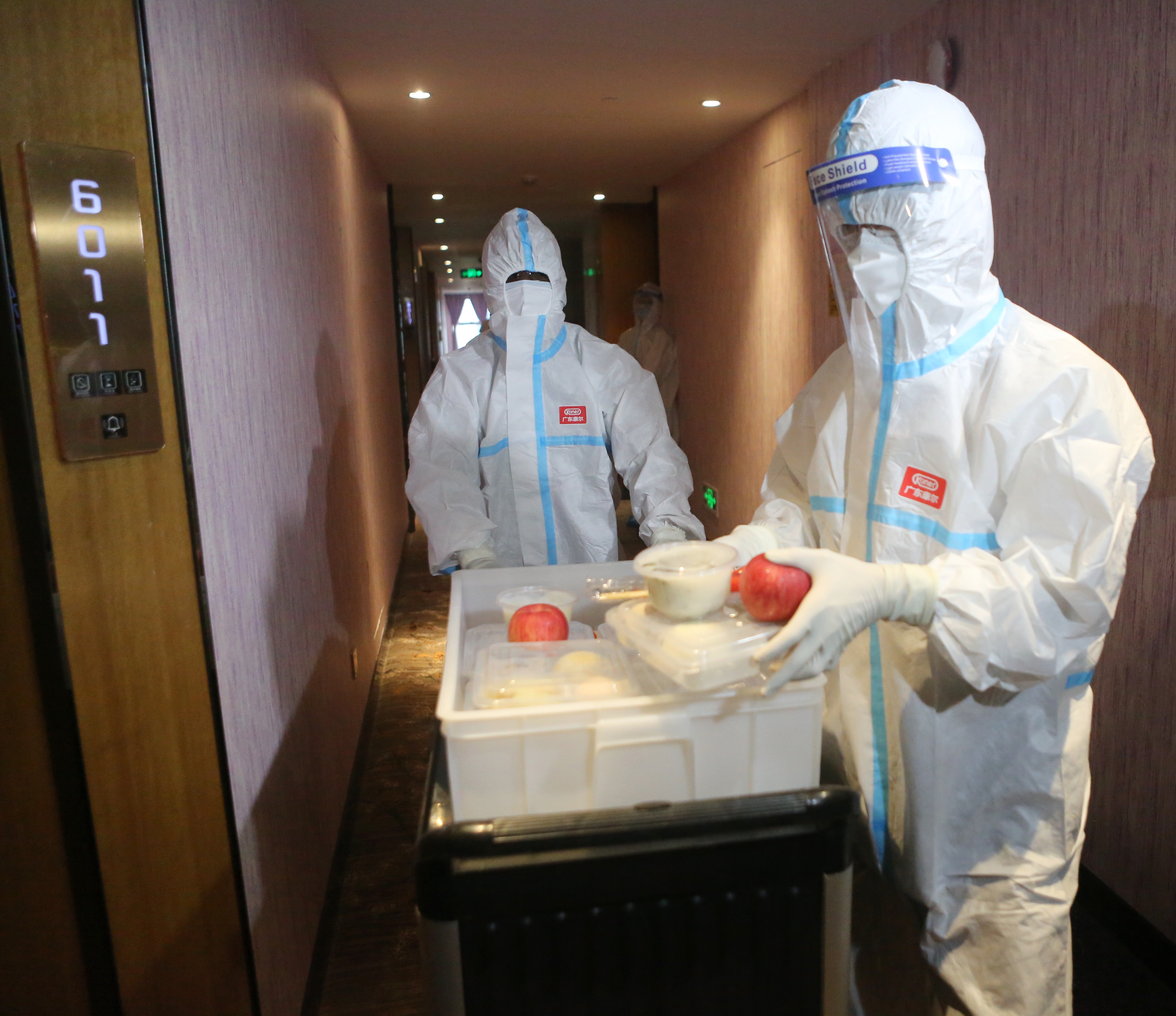 为了兼顾学校网课,简小东多次主动请缨深夜、清晨接机的“累活”。比如6点接机,家住番禺的他凌晨3、4点就要起床,防护服一穿就是6、7个小时,不吃、不喝、不上厕所,到了盛夏8月尤其闷热难耐。