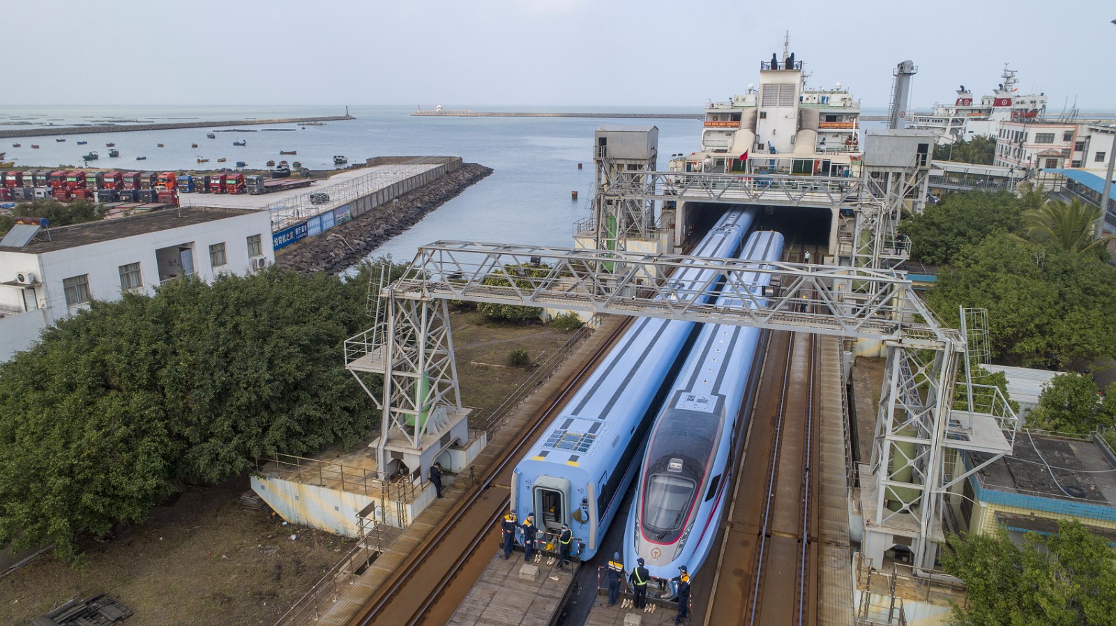 2021年1月31日,海口,“海军蓝”CR300AF型复兴号乘坐海南铁路轮渡正式登陆海南岛,助力海南自贸港建设和今年春运。(来源:视觉中国/中新网)