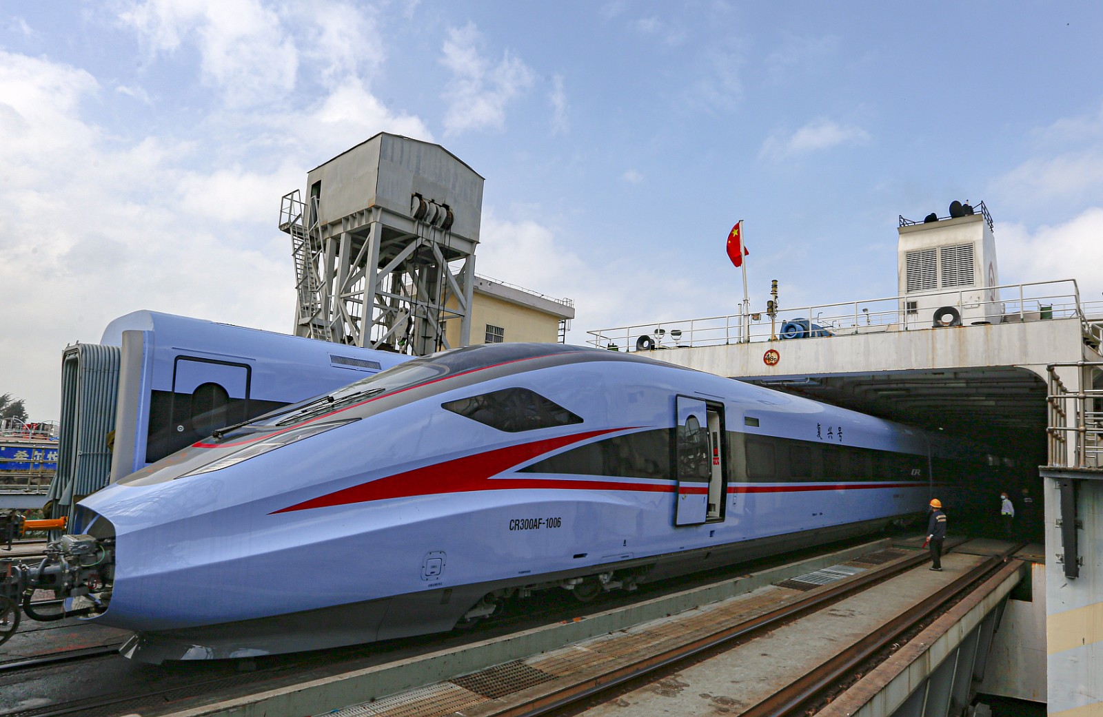2021年1月31日,海口,“海军蓝”CR300AF型复兴号乘坐海南铁路轮渡正式登陆海南岛,助力海南自贸港建设和今年春运。