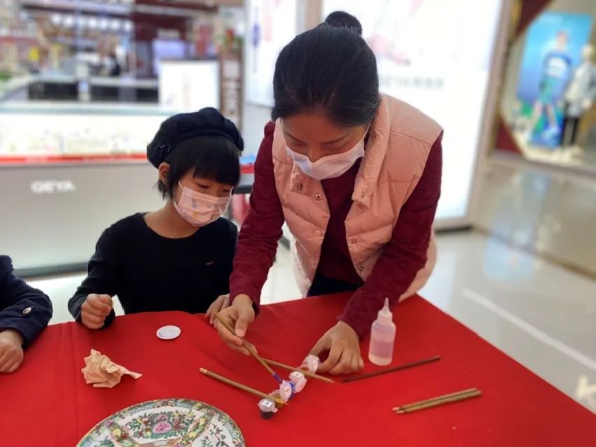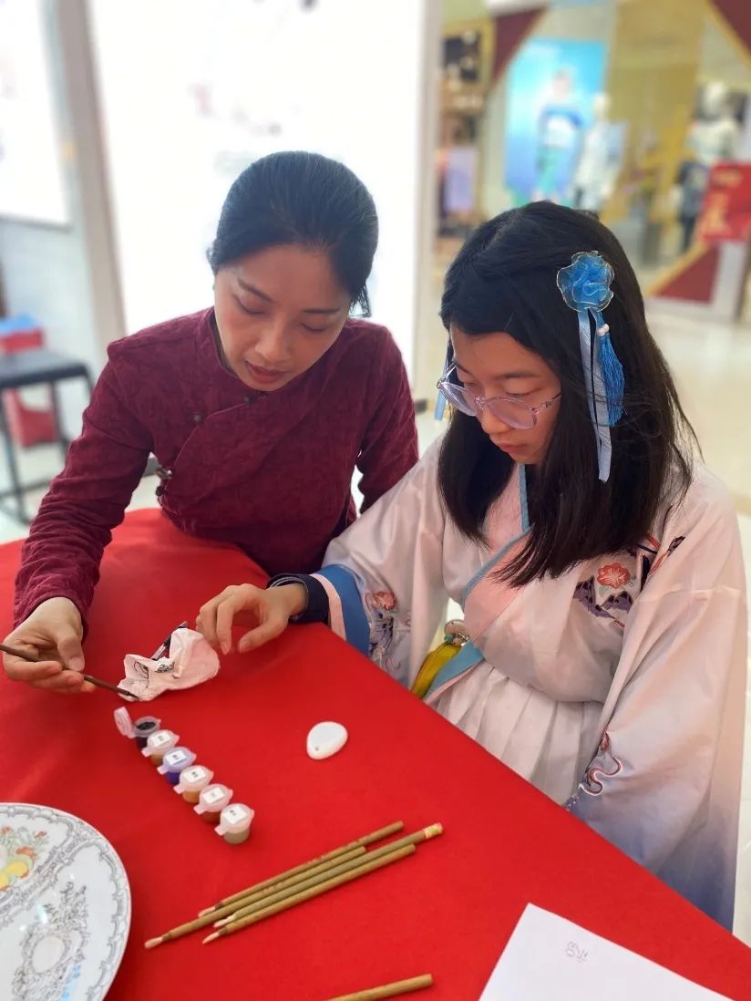 同样作为传统非遗手工艺的广彩,也吸引了不少亲子共同参与,瓷胚、画笔、颜料、模板整齐摆放在桌面,供大家近距离体验广彩的魅力。不仅如此,广彩非遗传承人许珺茹还耐心地从描线到上色,按步骤进行了现场示范。“你的笔尖立起来一点,就可以让线条更细哦!看,就像这样握笔……”虽然初次接触广彩绘画的孩子略显生涩,但也在许老师的指点之下,也慢慢学会了轻推画笔、勾勒线条,并逐渐掌握广彩绘画的小窍门,创造出了富有想象力的广彩作品。“我画了个‘福’字,正好搭配我新买的汉服,感觉广彩制作特别有趣!”一名身着汉服的同学捧着自制的广彩作品说道。