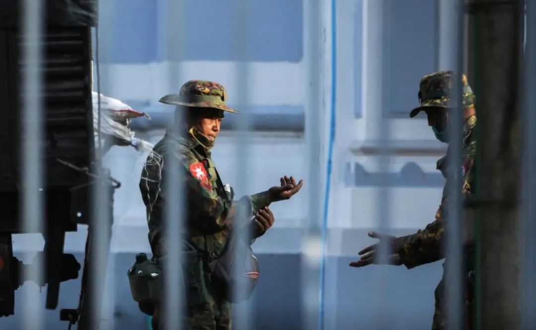 当地时间2月1日,缅甸仰光市政厅外出现缅甸士兵。图源:路透社二