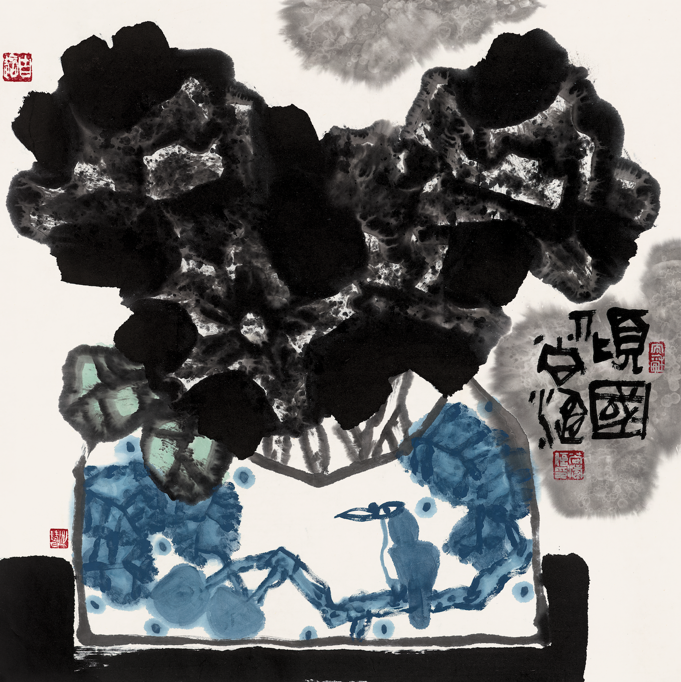 尚涛在艺术中追求“大器”,追求强烈的视觉震撼——大花、大鸟、大鱼、大果、大器,引发心与物、心与心的撞击。尚涛的画作意趣古拙又不乏现代感,简约静谧、大墨酣畅;书法融篆、隶、狂草于一炉,苍劲浑厚、气势磅礴。