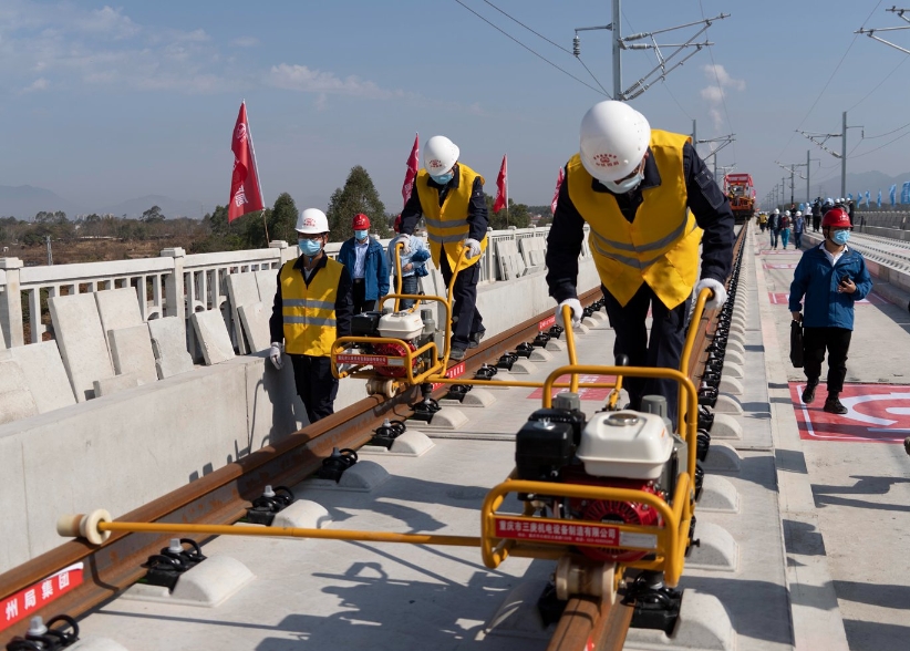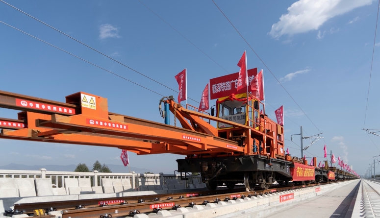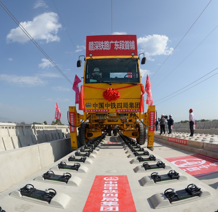 2月1日上午,在赣深高铁广东段汕湛高速特大桥施工现场,随着现场总指挥一声令下,21吨10米长的铁路有砟无砟轨道铺设一体式铺轨机组发出阵阵轰鸣,拖拽着一对500米的长轨缓缓前进。8分钟后,长轨稳稳地落在轨道板上,标志着赣深高铁广东段正式开始铺轨。