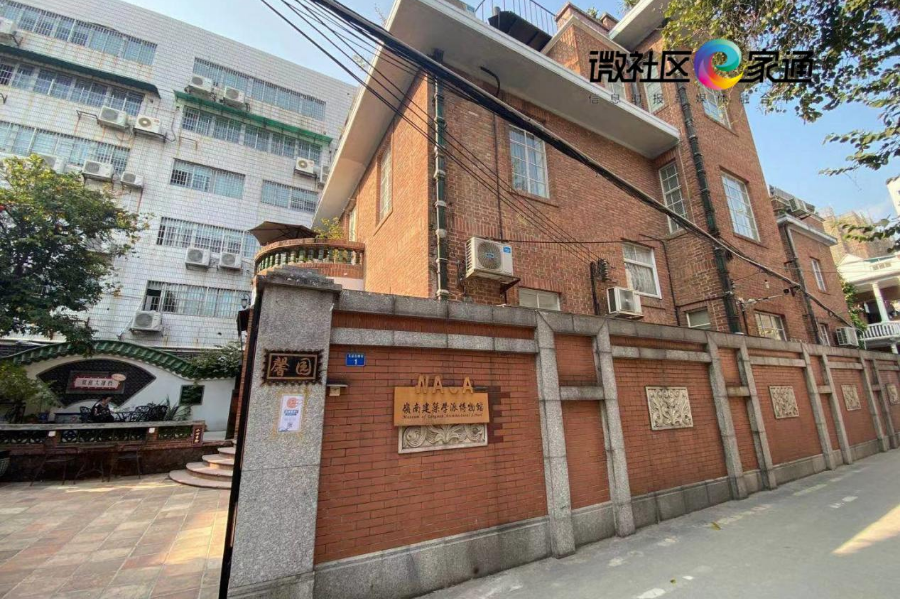 清水红砖墙,大门二层出挑弧形阳台,室内花阶砖保留完整。位于东山口的馨园建于民国十二年(1923年),原名“永昌园”,高两层,带院落,是民国广州第一任警察署署长的官邸。建筑风格为早期现代式,具有清水红砖墙、壁炉等价值要素。