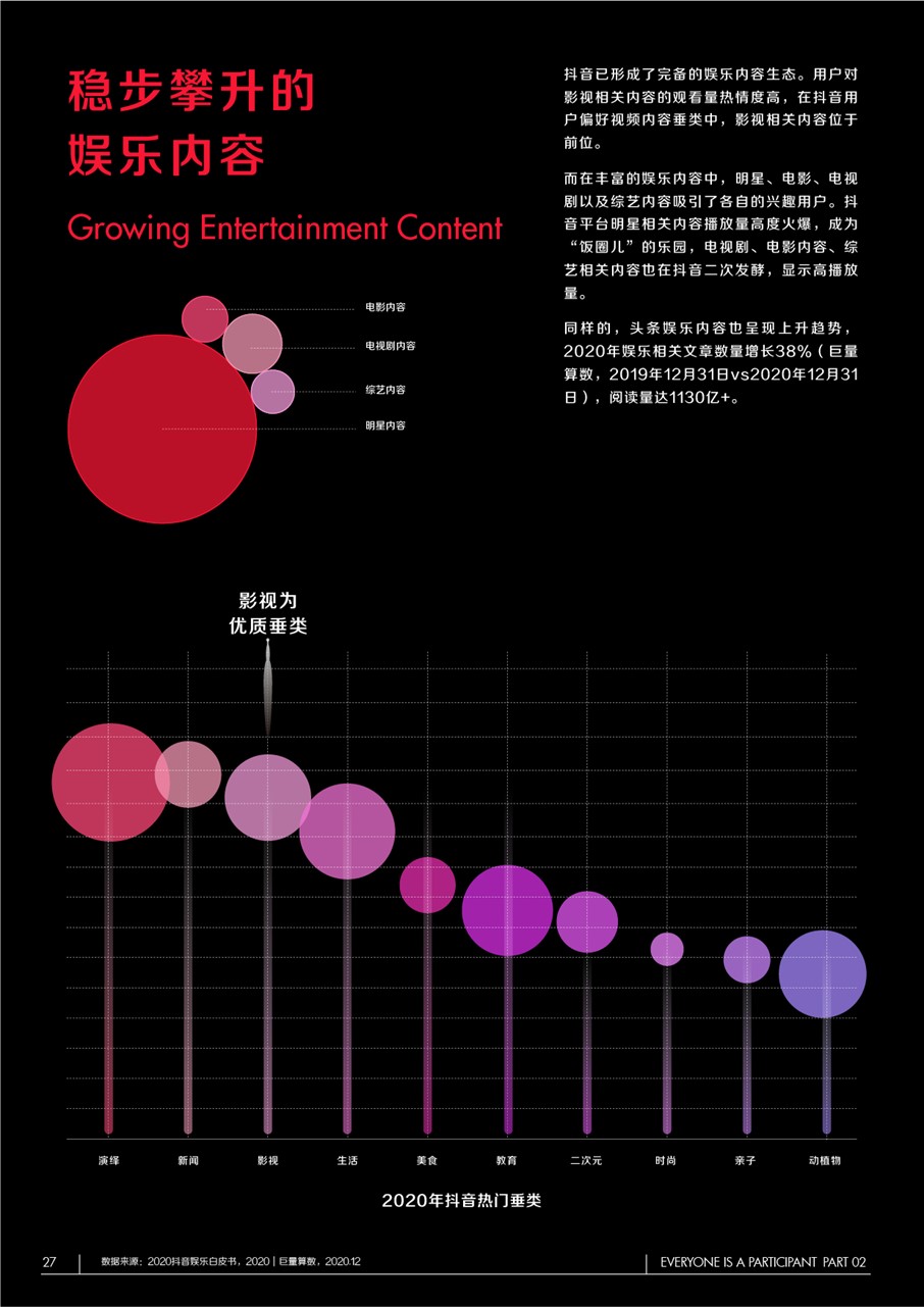 如今,抖音已形成了完备的娱乐内容生态。在丰富的娱乐内容中,明星、电影、电视剧以及综艺内容吸引了各自的兴趣用户,其中用户对影视相关内容的观看量保持高热情度,同样明星相关内容播放量高度火爆,成为“饭圈儿”的乐园,电视剧、电影内容、综艺相关内容也在抖音二次发酵,显示高播放量。此外,头条娱乐内容也呈现上升趋势,2020年娱乐相关文章数量较2019年增长38%,阅读量超1130亿。