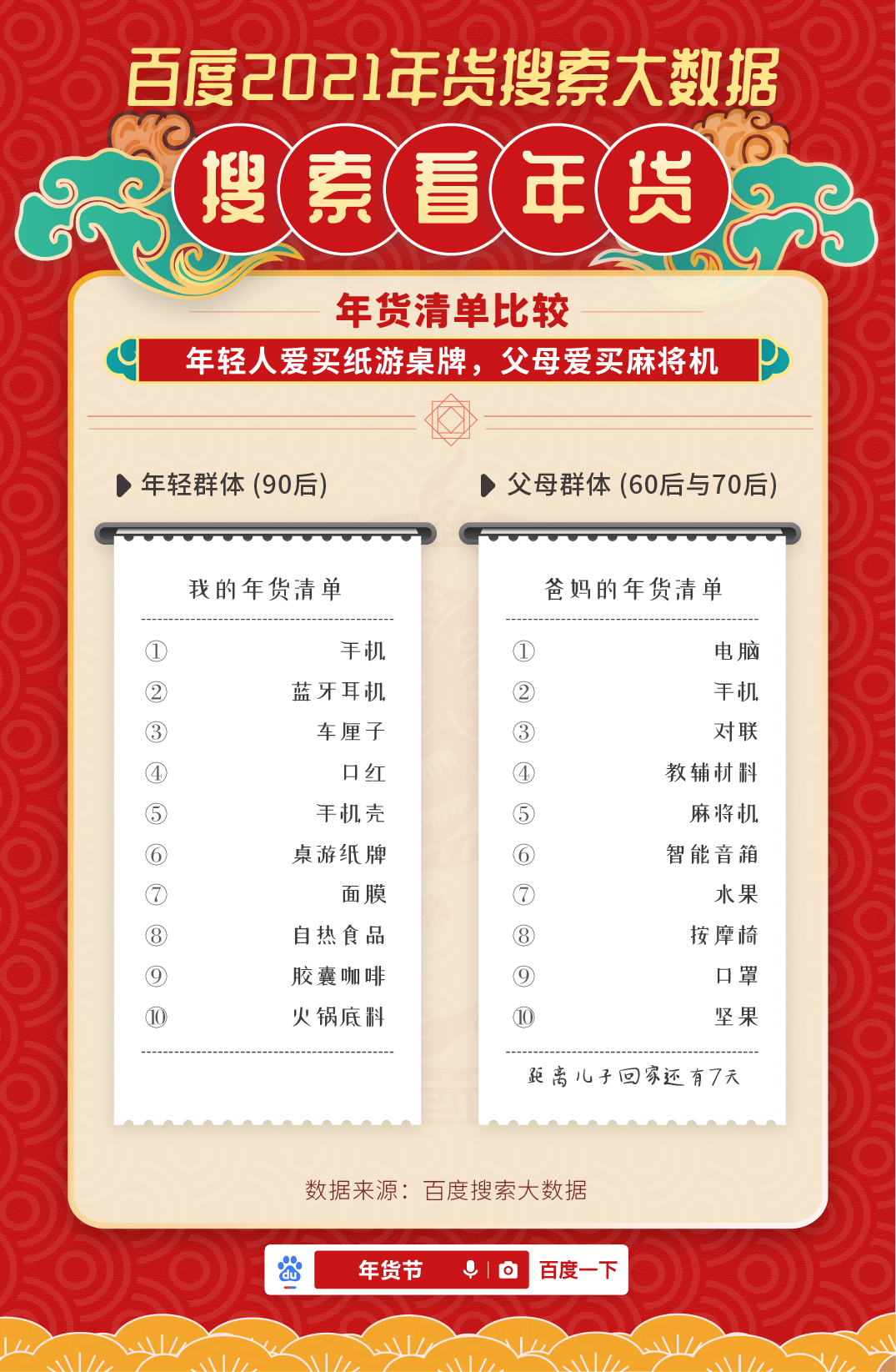 一年之计在于“购”。在青睐年货的类型上,不同年龄段各有不同。百度搜索大数据显示,以90后为代表的年轻群体的年货清单集中为数码产品、美妆与零食——手机、蓝牙耳机与车厘子的搜索关注度位列前三。