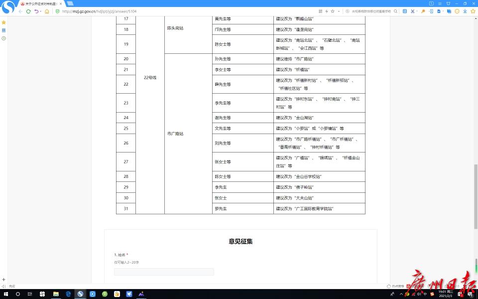 今天市民政局官网公布的消息显示,市民建议的20多个站名无一入选。