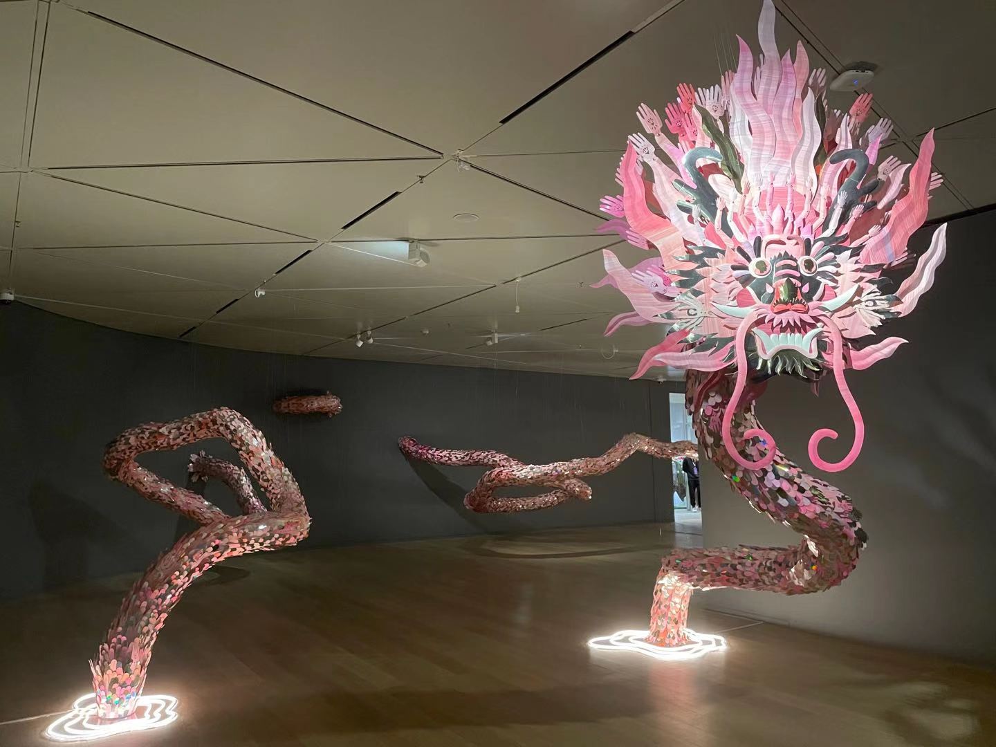 记者在现场看到,展览入口处便高高悬挂着一条用纸做的粉红色的龙——即作品《不息》,这条龙的身体被拆开安置在展览各处,粉红色的身体由深浅不一的条状纸片拼接而成。龙的身体细节更是令人惊叹,鳞片处暗藏着剪成小人和手臂式样的剪纸。