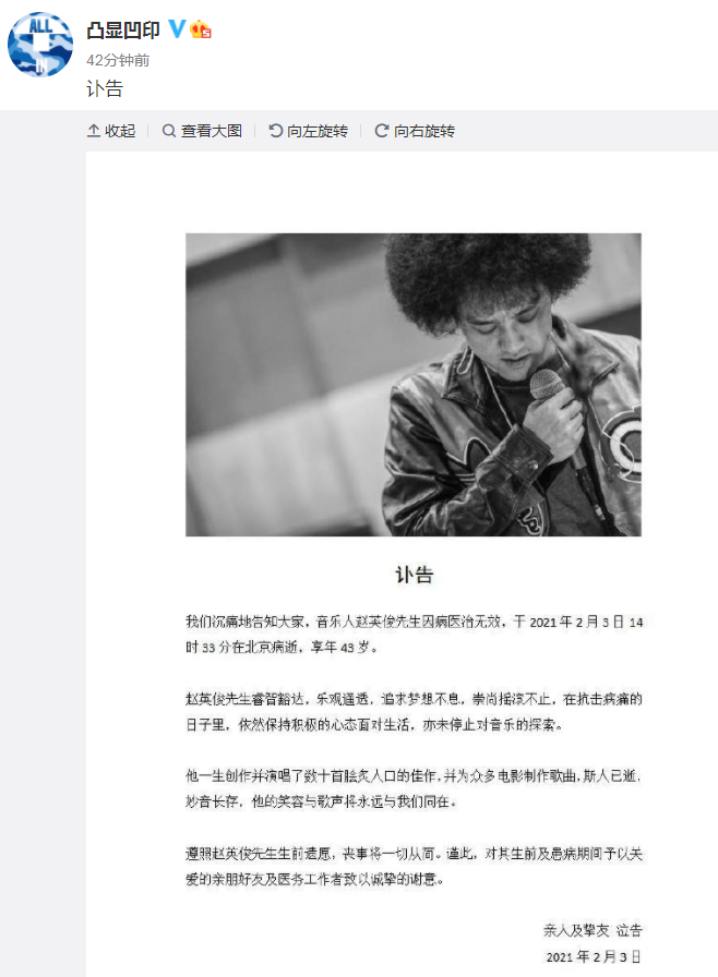 2月3日,据音乐人赵英俊所签约公司北京凸显凹印文化发展有限公司微博,赵英俊家人发布讣告,称赵英俊因病医治无效,于2021年2月3日14时33分在北京病逝,享年43岁。讣告表示将遵照赵英俊生前遗愿,丧事一切从简,“对其生前及患病期间予以关爱的亲朋好友及医务工作者致以诚挚的谢意”。据悉,赵英俊曾为《送你一朵小红花》《唐人街探案》《煎饼侠》《港囧》电影等创作主题曲。