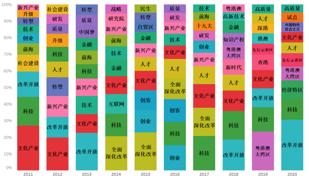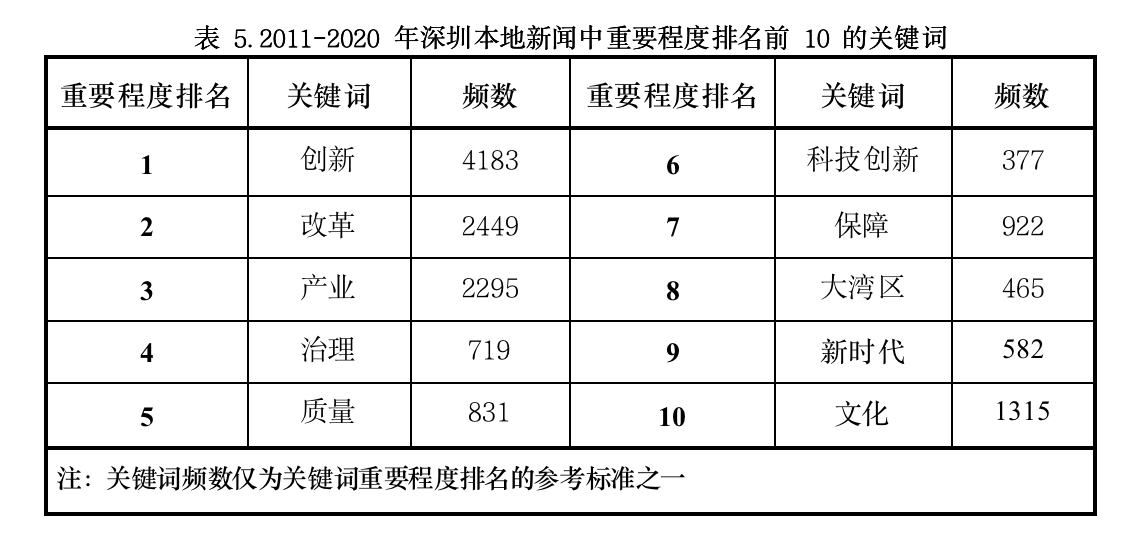 2011-2020年,深圳建设转向以创新驱动发展的战略。如表5所示,关键词“创新”二度占据两个10年阶段的关键词榜首,新闻报道中提及“创新”的频数也成倍增加,清晰地反映出深圳的创新型城市定位。与上一阶段相比,深圳不仅继续大力实施创新战略,还深化多元化创新发展,如关键词排名第6的“科技创新”,第10的“文化”,第13的“粤港澳”,排名前15%的“先行示范区”等,体现了深圳赋予创新发展更丰富的内涵。