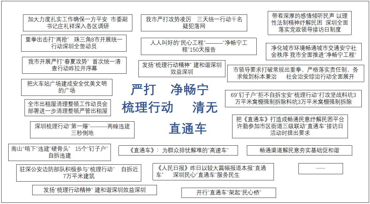 同时期,深圳也出现“治安环境日趋恶劣,城市环境捉襟见肘”等问题。为此,深圳出台了一系列措施治理社会问题。这一阶段出现了新的新闻高频关键词,如“严打”“梳理行动”“清无”“净畅宁”等,检索其关联新闻报道发现(如图6),深圳从2001年起,加大社会治理力度,开展“严打”行动,处理社会治安问题和城市建设问题。关联报道显示,2003年深圳开展了疏导城市交通的“净畅宁工程”,2004年开展查处违章建筑的城市“梳理行动”,2005年推出整治非法经营的“清无行动”,到2006年深圳市委还在深圳特区报开辟了《直通车》栏目,回应社会关切。