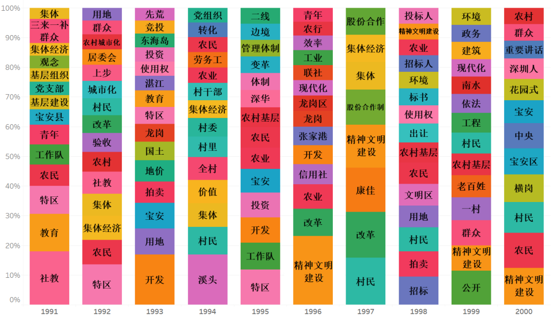 在此阶段,深圳立足自身发展进程,完善城市建设,开启了深圳农村城市化道路。并且,数据分析结果显示,“农村城市化”在1992年的深圳新闻中重要程度排名第8,在城市建设类新闻中排名第1,记录了深圳发展的时代印记。
