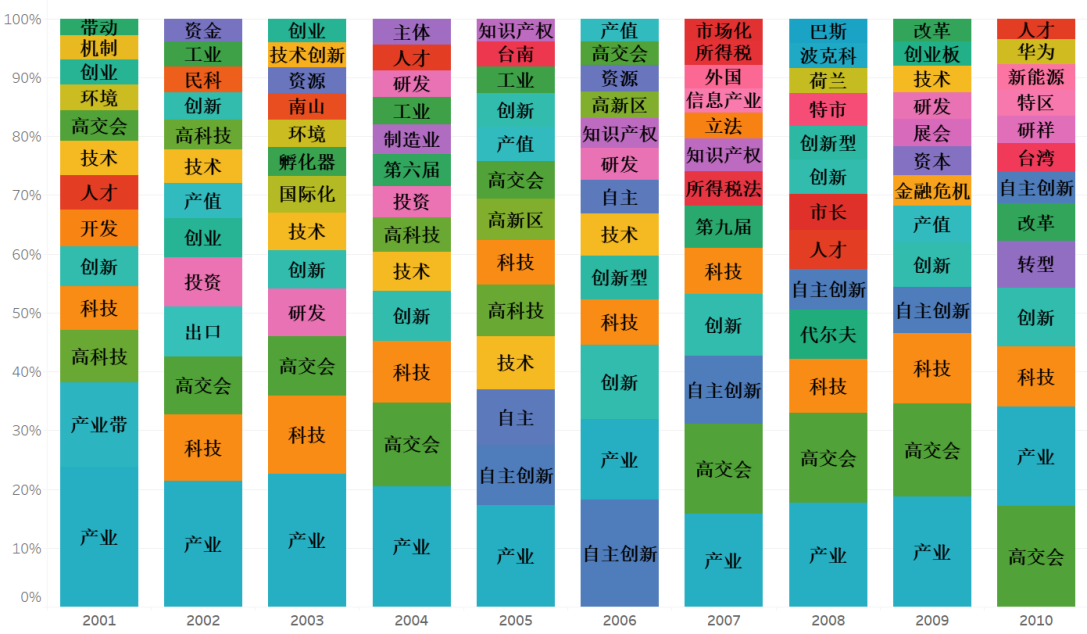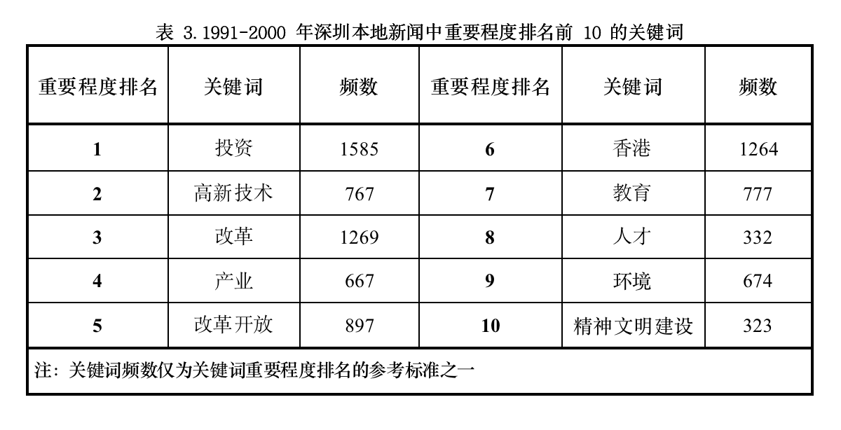 1991-2000年是深圳艰苦奋斗、埋头苦干的十年,在城市建设和经济转型的道路上摸索出了一条符合深圳的发展道路。1992年,邓小平同志在深圳发表重要讲话(即“南方谈话”),提出要坚持不懈,加快改革开放的步伐。如表3所示,这一阶段排名前10的关键词反映了深圳开始重视高新技术,发展第三产业,鼓励人才引进,推进城市治理和建设,由此开启深圳发展的新征程。