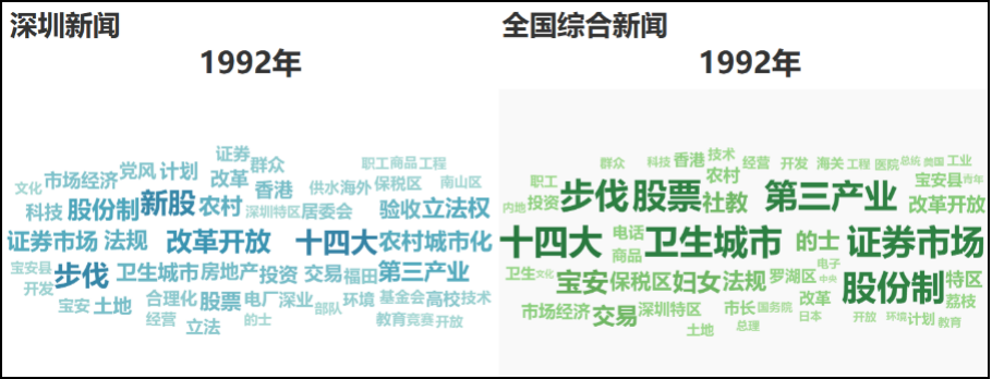 图3. 1992年深圳新闻词云图(左图)和全国综合新闻词云图(右图)