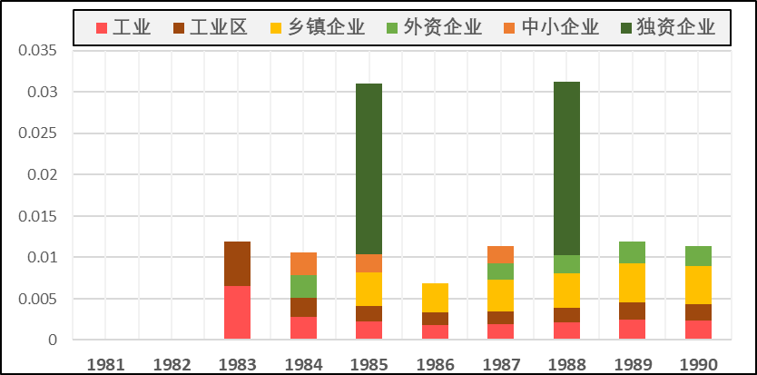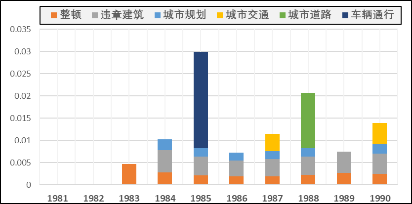 处于发展初期的深圳特区,为营造良好的投资环境以吸引外资,特别是来自香港的投资,积极响应对外开放政策,进行大规模城市基础设施建设,鼓励并扶持各类企业发展。分析文本数据发现(如图2),“城市规划”“违章建筑”“整顿”这些词在城市建设类文章中几乎每年都被提及(分别出现了6年、7年、8年),尤其是“违章建筑”每年所占比重都排名前二;而在企业建设类文章中,“独资企业”在1985和1988年占比第一,“乡镇企业”“外资企业”“工业区”“工业”几乎连年出现,呈现了深圳发展初期,城市建设和工业建设的高速发展。也正是在此阶段,深圳提出了“时间就是金钱,效率就是生命”的口号,创造出三天一层楼的深圳速度。