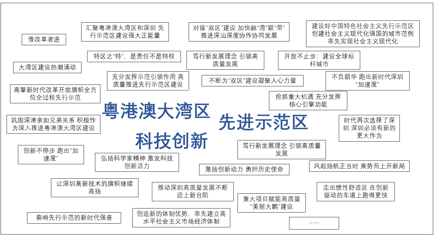 2020年是党中央国务院提出深圳建设社会主义先行示范区一周年,并在同年授权深圳实施综合改革试点。深圳积极响应,大力推进先行示范区建设,积极发挥粤港澳大湾区核心引擎城市作用。分析与“粤港澳大湾区”“先行示范区”和“科技创新”相关联的新闻报道(如图9),可以发现,深圳积极推动“双区”建设,不断激发群众信心。