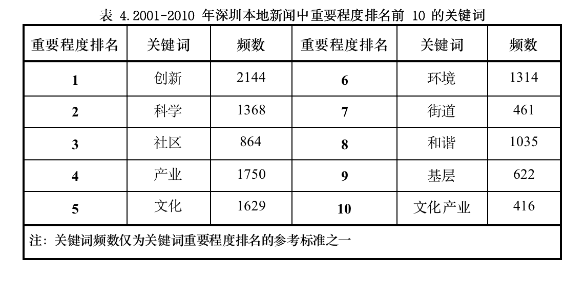 2001-2010年阶段排名前10的关键词(如表4)反映了当时深圳在经济发展方面,注重自主创新,大力发展高新技术产业;在社会治理层面,着力解决发展过程中的挑战和问题。另外,数据分析显示,“发展观”“民生”“生态”“整治”“物流”“服务业”这些关键词重要程度排名前20%,体现了深圳当时对多元化发展道路的探索。