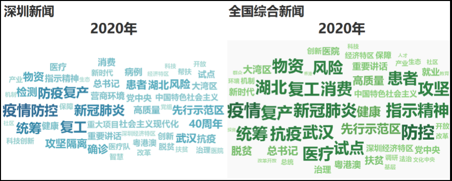 图8.2020年深圳新闻词云图(左图)和全国综合新闻词云图(右图)