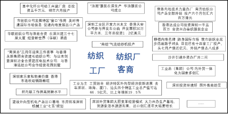 分析与“外向型经济”主题相关的新闻报道,发现其与“纺织”“纺织厂”“工厂”“客商”等关键词高度关联,反映出当时纺织工业对深圳的外向型经济有较大贡献。图1展示了这一时期包含“纺织”“纺织厂”“出口”“客商”等关联词的部分新闻标题。在此阶段,深圳开辟了“外引内联,工贸结合”的发展路径,初步形成以工业为主的外向型经济格局。