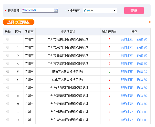 2月3日中午12时,广州日报记者查询了2月5日至2月12日之间的结婚和离婚登记预约信息,发现目前各区的结婚预约名额非常充足,而离婚登记预约名额,花都区、从化、番禺区、增城区等单日还剩1个名额(具体情况处于变动中,建议市民提前查询官方平台)。