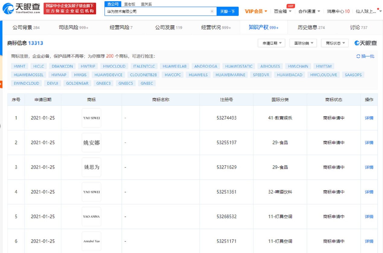此前,天眼查App显示,华为技术有限公司新增多条“姚安娜”“姚思为”“YAO ANNA”“YAO SIWEI”“Annabel Yao”的商标信息,国际分类涉及教育娱乐、机械设备、科学仪器等,申请日期为2021年1月25日,目前商标状态显示为“商标申请中”。