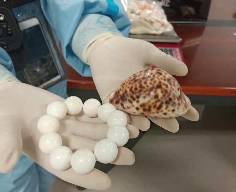 海关关员查获旅客违规携带进境的砗磲制品和虎斑宝贝