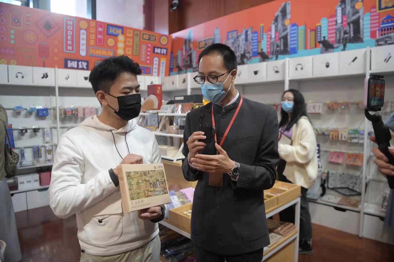 《黄金国之谜》展出的木乃伊和黄金面具更是令他驻足良久,沉浸在秘鲁安第斯文明的异域风情之中。此外,蒋涛还参观了广东省博物馆文创产品商店,本身就是学习设计专业的他对各式各样的文创产品赞不绝口。