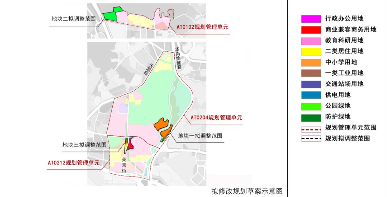 其中,地块一用地性质由一类工业用地和绿地修改为中小学用地,用地面积约11公顷,容积率0.7。同时地块内部新增一条15米宽环形细分支路。地块二根据森林公园总体规划自然保护地要求,用地性质由教育科研用地修改为公园绿地,用地面积约9公顷。地块三用地性质由行政办公用地、防护绿地及二类居住用地修改为商业兼容商务用地,用地面积约2公顷,容积率2.5。同时按照现状道路及高压走廊调整规划道路路位,道路宽度26米不变。
