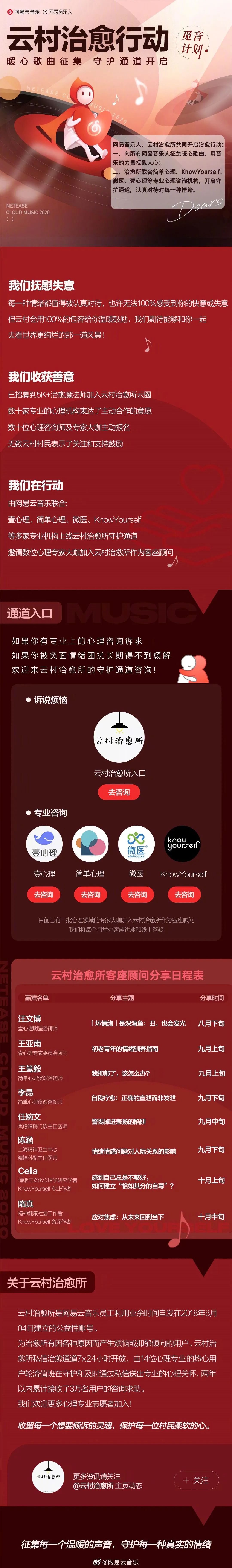 尤其,网易云音乐评论区留言质量普遍较高,用户自发地参与创作,营造了令人有归属感的“云村”社区。去年,在“网抑云”事件发酵后,网易云音乐也迅速应对,推出“云村评论治愈计划”,邀请心理专家、心理专业志愿者加入“云村治愈所”,同时升级《云村公约》,规范乐评礼仪。可见产品团队对于社区氛围的重视程度。