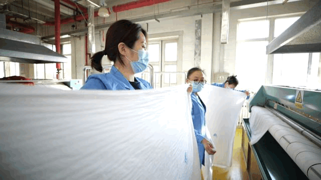 经过洗涤的卧具被烘干后,工作人员会用高温熨烫机进行最后的处理:一方面熨烫卧具至平整,另一方面可以进一步高温消毒。熨烫温度可达175℃左右,保证有效杀灭细菌和病毒。
