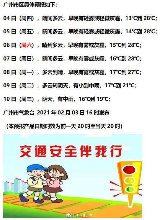 2月6日,晴到多云,早晚有轻雾或轻微灰霾,15~28℃。
