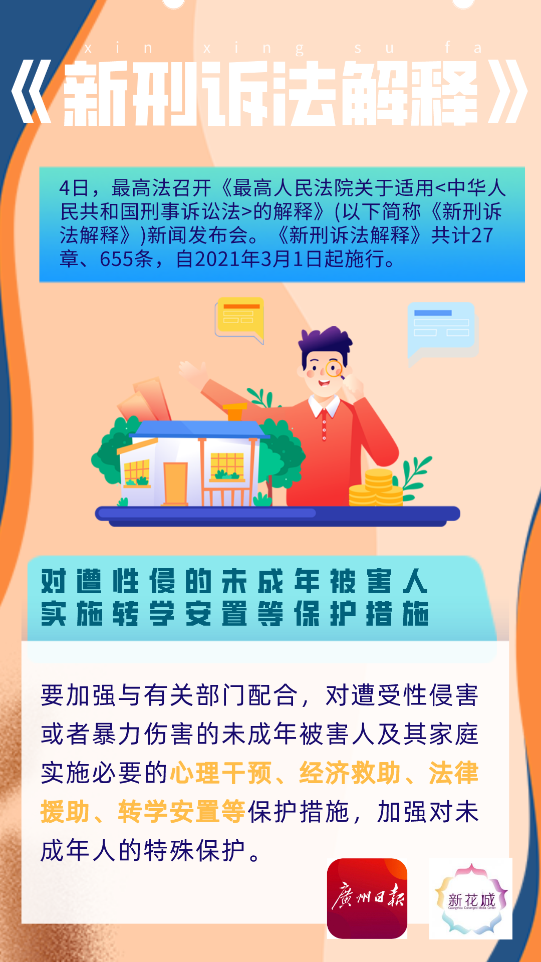 《新刑诉法解释》规定,要加强与有关部门配合,对遭受性侵害或者暴力伤害的未成年被害人及其家庭实施必要的心理干预、经济救助、法律援助、转学安置等保护措施,加强对未成年人的特殊保护。
