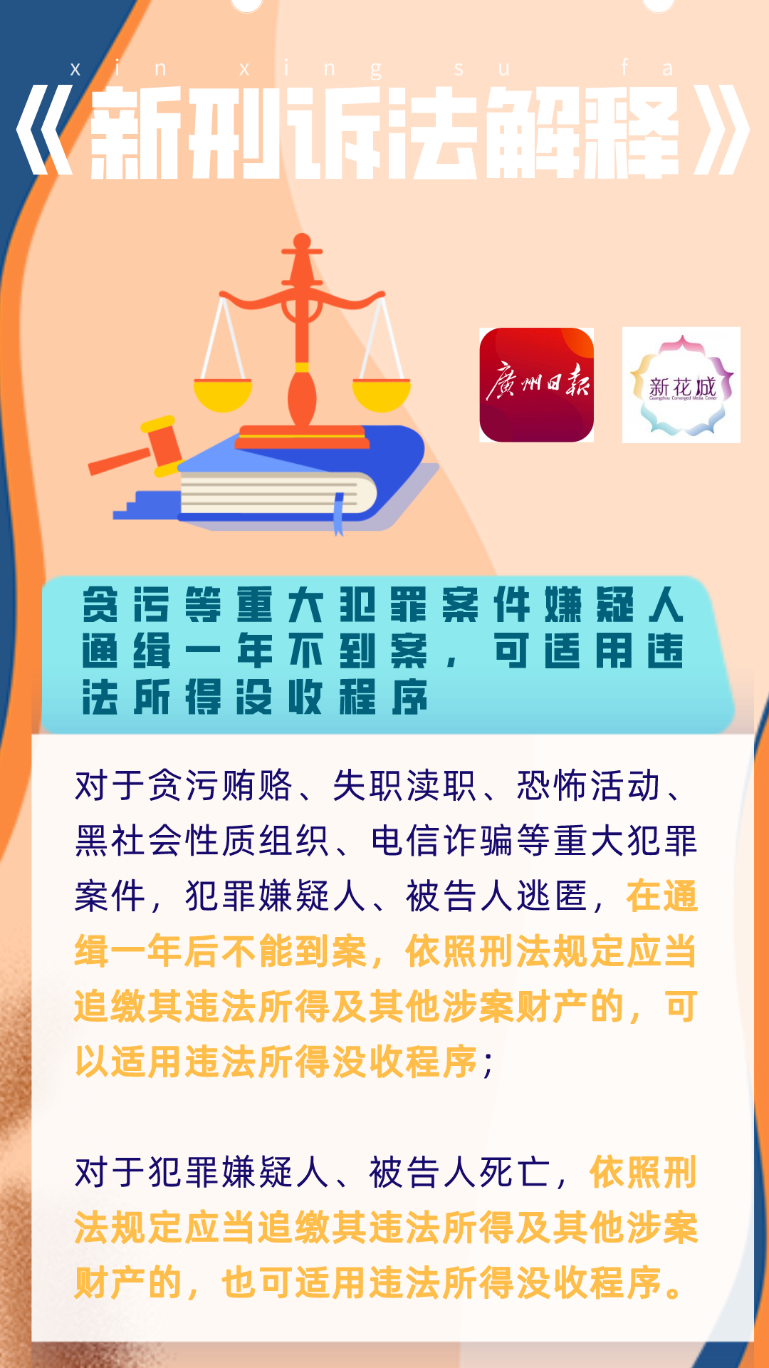 织密法网,决不让腐败分子和其他犯罪分子逍遥法外、逃避惩罚。《新刑诉法解释》设专章对缺席审判程序作了细化,规定对于贪污贿赂犯罪案件,以及需要及时进行审判,经最高人民检察院核准的严重危害国家安全犯罪、恐怖活动犯罪案件,犯罪嫌疑人、被告人在境外的,可以适用缺席审判程序依法作出判决,并对违法所得及其他涉案财产作出处理。