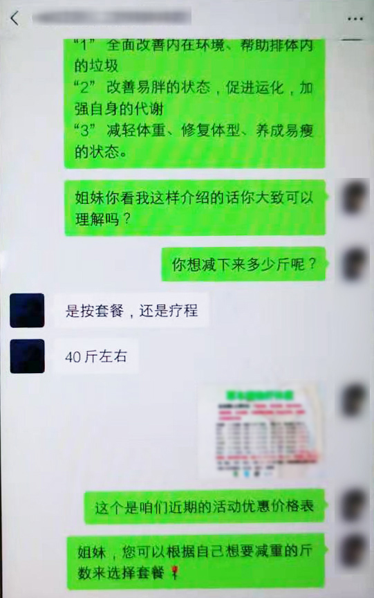 她加了群里一个网名为“王X”的“减肥达人”为好友,并在对方的介绍下,购买了价值2000多元的“闪X瘦身茶”等品牌产品的减肥套餐,套餐中包括减肥代餐、饮品以及降脂降压的中成药等。经过几天的试用,小璐感觉效果不佳。对此,对方的解释是,因为小璐没有对自己的身体状况进行科学全面的评估,购买的产品缺乏针对性。对方强烈建议她与上述减肥产品公司的营养顾问对接,让营养顾问进行专业评估指导,一对一“私人订制”适合她体质的产品套餐。