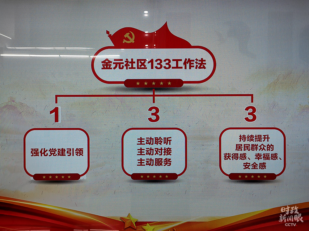 △金元社区的“133工作法”,“1”是强化党建引领,第一个“3”是社区工作要“主动聆听、主动对接、主动服务”。(总台央视记者杨立峰拍摄)在去年7月召开的基层代表座谈会上,习近平总书记针对基层工作提出要求:要更加聚焦人民群众普遍关心关注的民生问题,采取更有针对性的措施,一件一件抓落实,一年接着一年干,让人民群众获得感、幸福感、安全感更加充实、更有保障、更可持续。