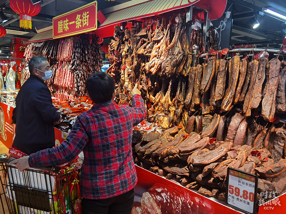 △超市内“腊味一条街”(总台央视记者史伟拍摄)节日市场供应如何 总书记实地检查