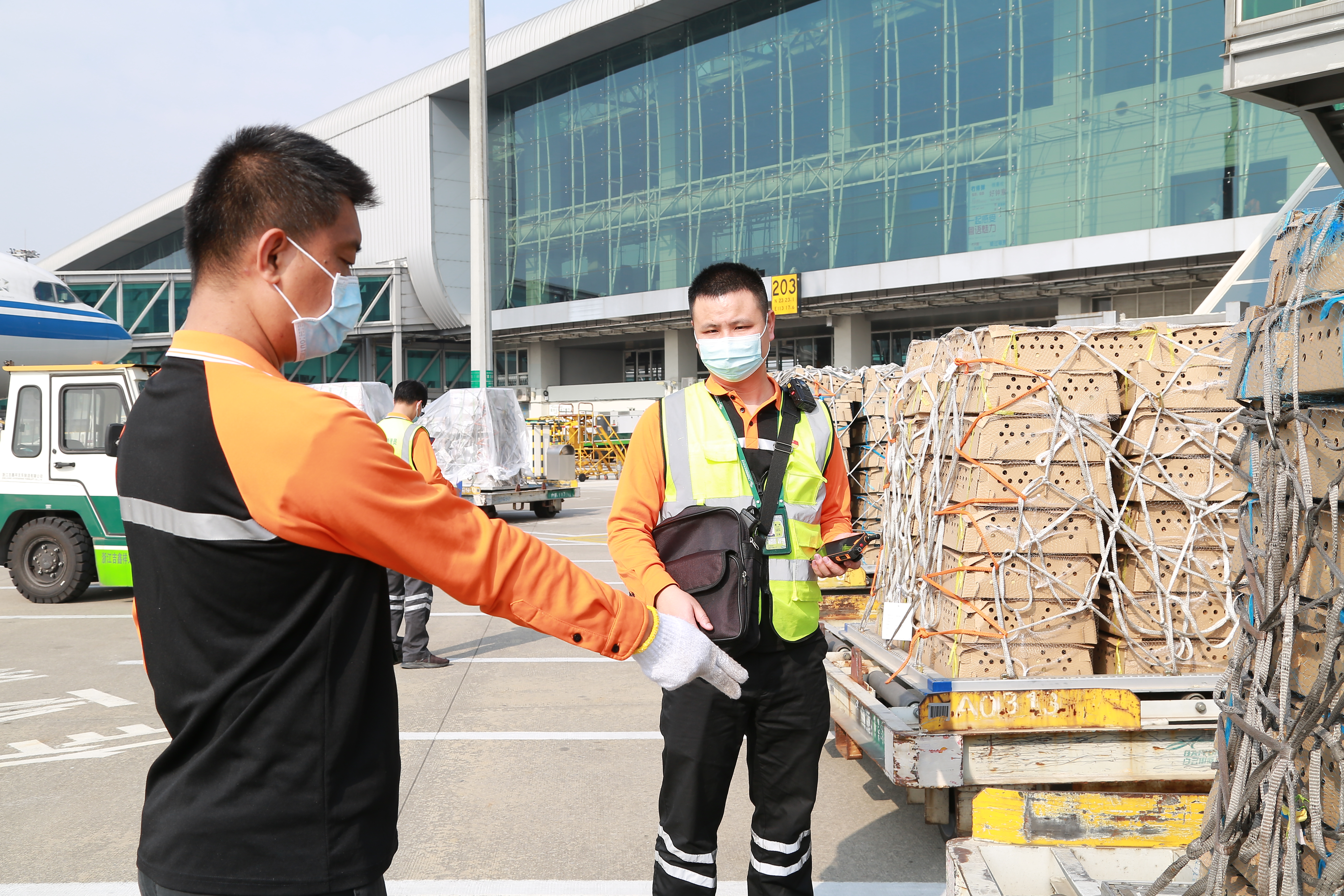 空旷的白云机场停机坪上没有一丝遮挡,面对深夜里广州气温的“骤降”,夏伟只穿着一件单薄的长袖在忙碌。“由于春节关系,不少陆运物流已经停运,货物很多靠航运进行。忙起来热热乎乎,一点儿也不冷。”夏伟说。