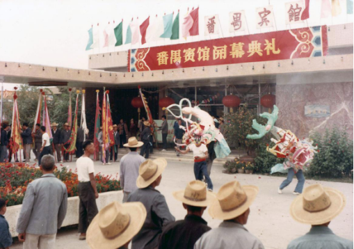 1980年12月13日,番禺宾馆开业时喜庆的场面。自此,番禺宾馆成为了旅外人士回乡省亲欢聚、国际商贾往来洽谈商务之选。