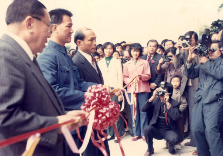 1980年12月13日,何贤先生(左一)、霍英东先生(左三)、番禺县县长黄伟宁(左二)为番禺宾馆开业剪彩。