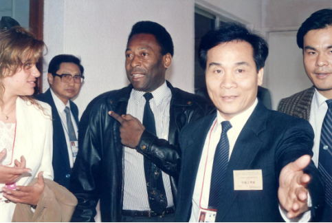 40年来,番禺宾馆迎来了众多中央及省市各级领导和海内外知名人士。番禺宾馆第一任总经理苏耀乾(前右一)接待世界球王贝利(中)。