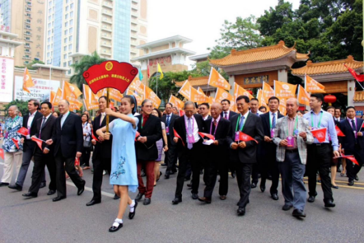2017年,第六届番禺旅外乡亲恳亲大会代表团代表从番禺宾馆出发前往英东体育馆主会场。本次恳亲大会共邀请了来自全世界21个国家和地区的91个旅外乡亲社团共1300名海内外嘉宾。