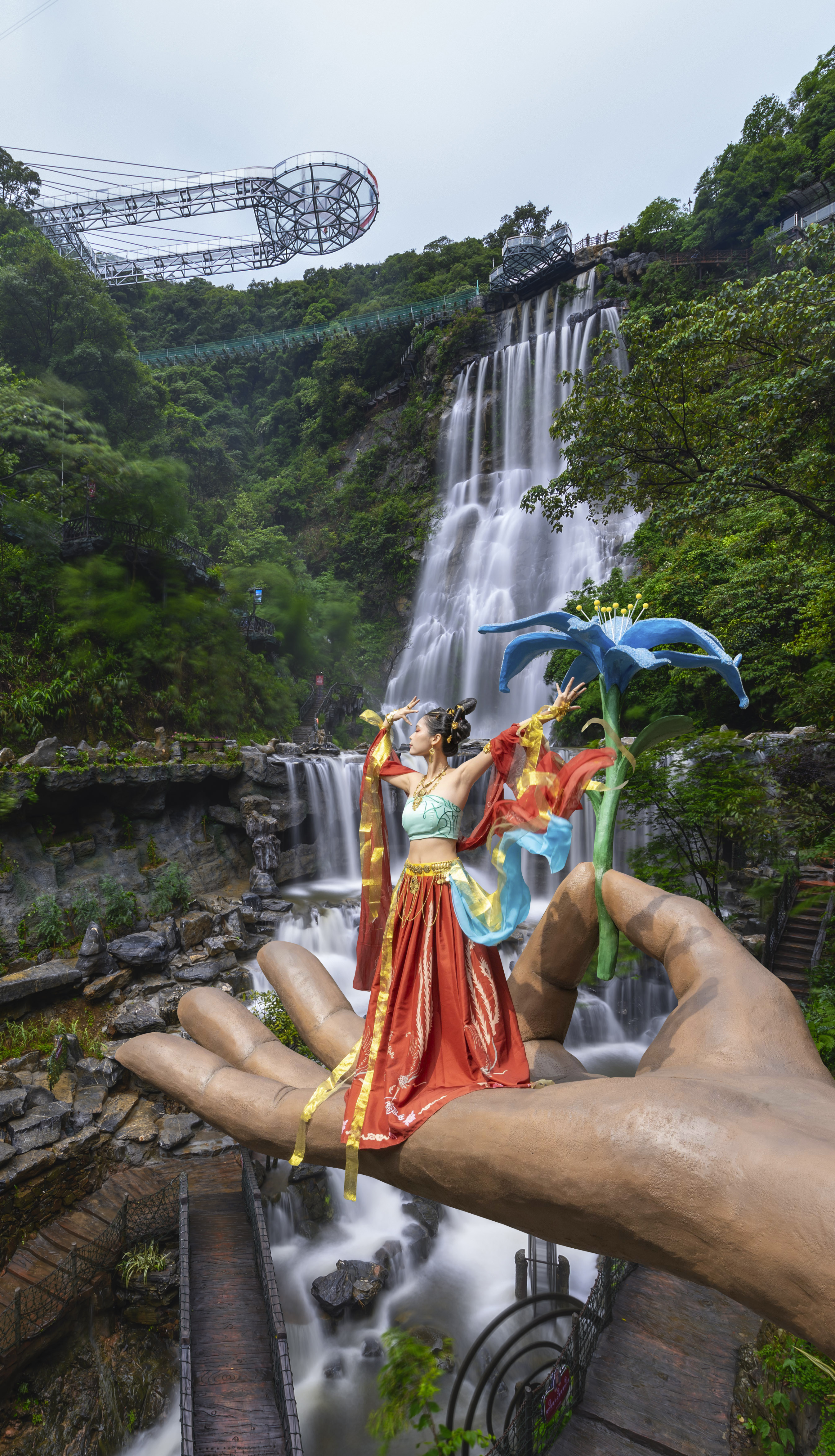 抖音流量超过10亿的“通天神掌”,终于迎来了姊妹篇“拈花之手”。拈花之手绽放在古龙瀑布的银色水幕中,与玻璃桥头通天神掌遥相呼应,造型优美,“拈花之手”高16米,由中国工艺美术大师李志群历时半年精心制作完成,以瀑布为背景凌空而出,期间为触发制作灵感,李志群曾经寻找了一千多位女性“手模”。“把你捧在手心里”,“拈花一笑 一笑倾城”这么美好而又温馨的寓意,令无数网红达人纷纷前来直播打卡。
