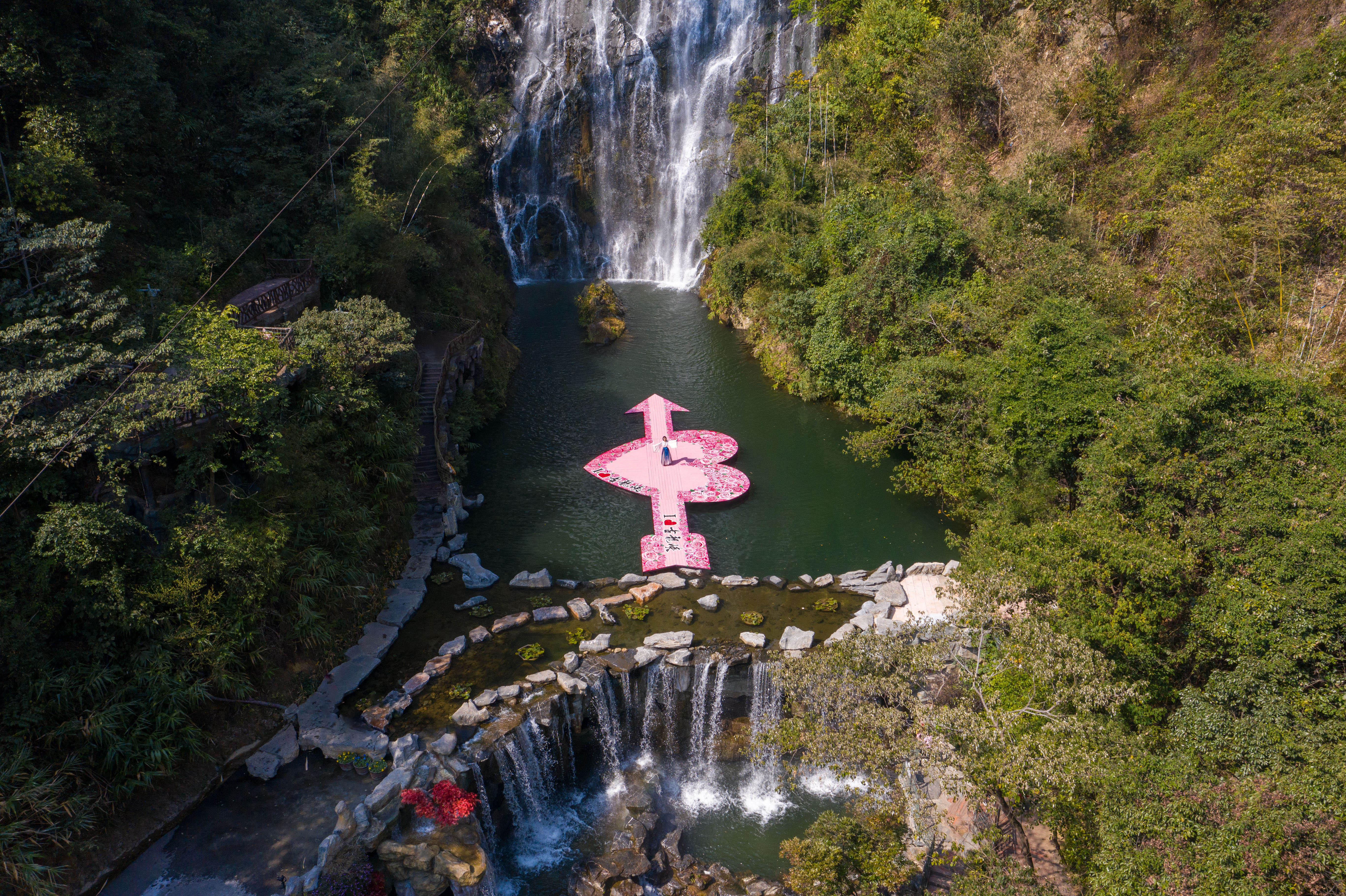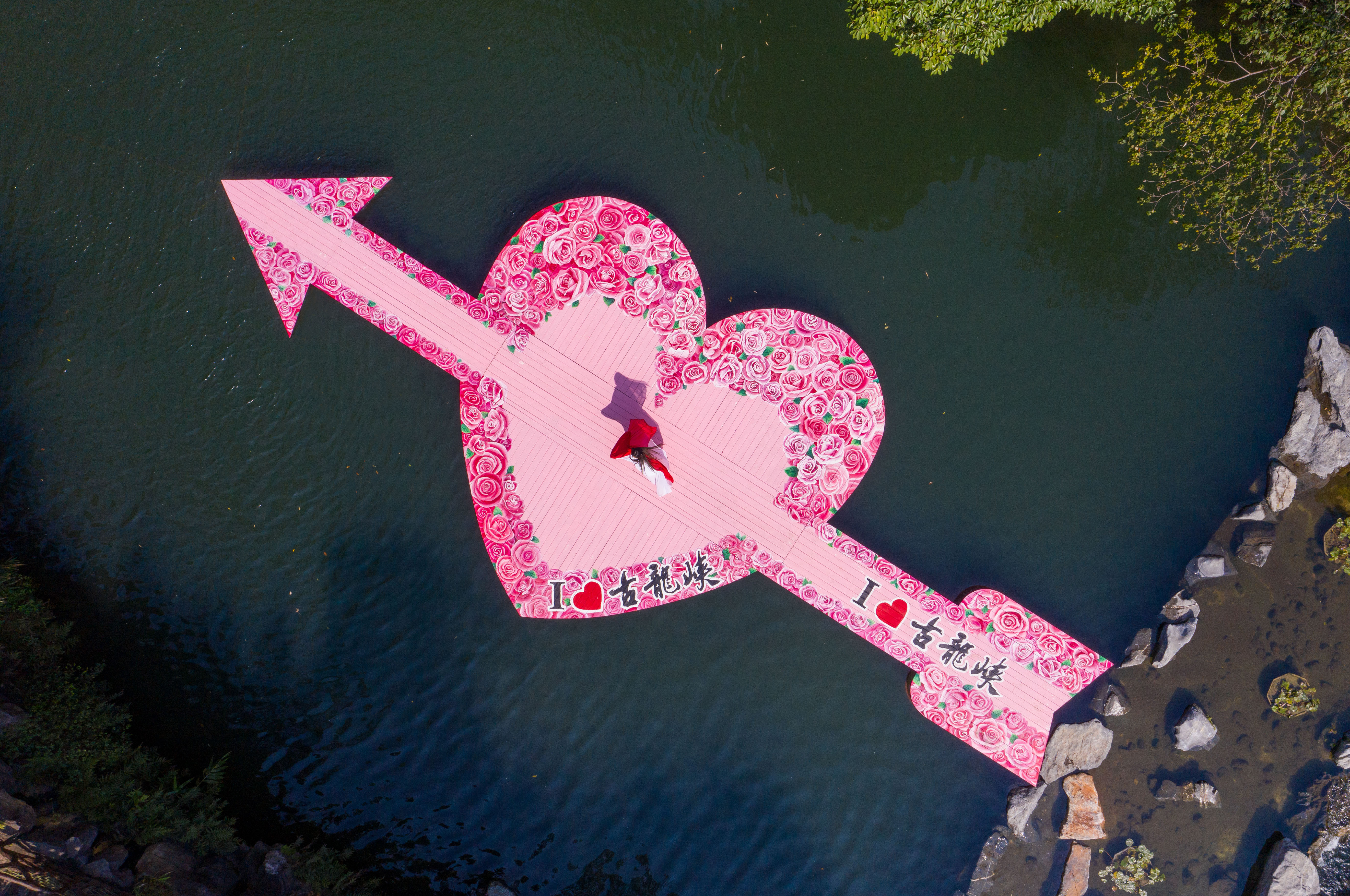 古龙大瀑布下的碧绿水潭里,一支粉色的爱神之箭射向瀑布,这是景区精心设计制作的丘比特爱情之箭,取名为“春心荡漾”。整个项目用浮台的原理设计制作,人站在上面就像坐在船上一样,会荡来漾去,可以同时容纳约100人同时拍照,游客也可以像网红摇摇桥一样,在上面随波荡漾,据景区相关负责人介绍,这个春心荡漾浮台是专门为年轻人设计的,寓意爱情犹如狂野的瀑布水从天而降,充满激情与浪漫。今年二月,春节串联元宵,料会成为古龙峡的新宠,年轻人的至爱。